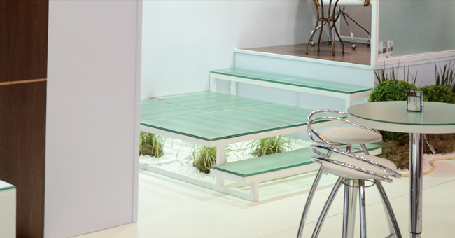 Há mais de 20 anos no mercado, a empresa catarinense participou da Fesqua pela segunda vez, expondo belas aplicações de vidros curvos laminados e multilaminados em escadas, cadeiras de balanço, pontes e guarda-corpoos, box e divisórias. Destaque para os laminados decorativos duplaface, com tecidos entre os vidros que simulam