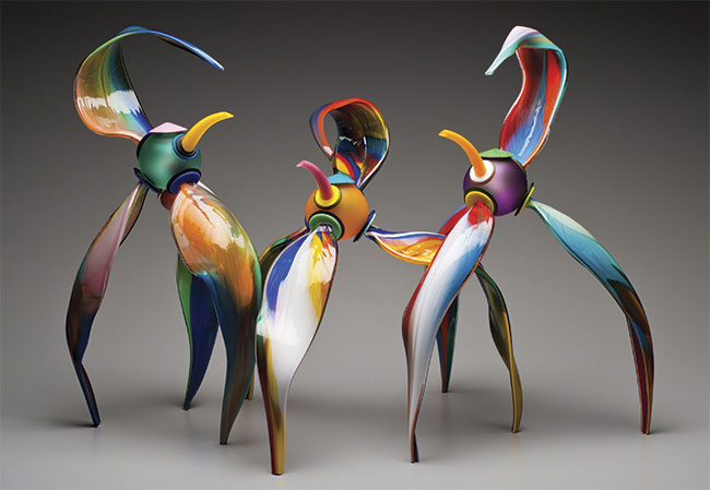Todo tipo de contato e experiência sensorial serve de inspiração para minhas obras”, diz o artista, que trabalha sozinho, em seu atelier rural situado nas imediações de afety Harbor, na Florida (EUA). Antes de pôr a mão na massa, o artista diz passar longas horas estudando, desenhando e projetando as cores e formas que deverá moldar no vidro. A base utilizada é composta por vidro de soda-cal (vidro comum), especialmente produzido para se misturar às cores, compradas na forma de bastão. Fabricadas na Alemanha, Nova Zelândia e Estados Unidos, essas hastes oferecem um amplo espectro de cores transparentes e opacas. “Desde o início do movimento americano ‘Studio Glass’, há cerca de 50 anos, até os dias de hoje, a evolução dos equipamentos, opções de cores e técnicas de produção do vidro soprado tem sido muito significativa”, observa. “É impressionante a gama de ferramentas e materiais de que os artistas e artesãos vidreiros dispõem para criar. ”Do quente ao frio Depois de moldá-las a quente, o artista leva as peças para seu estúdio, onde monta e finaliza suas obras. “Nessa etapa de acabamento, uso ferramentas diamantadas e d jateamento para esculpir ou gravar no vidro a frio”, revela Cox.