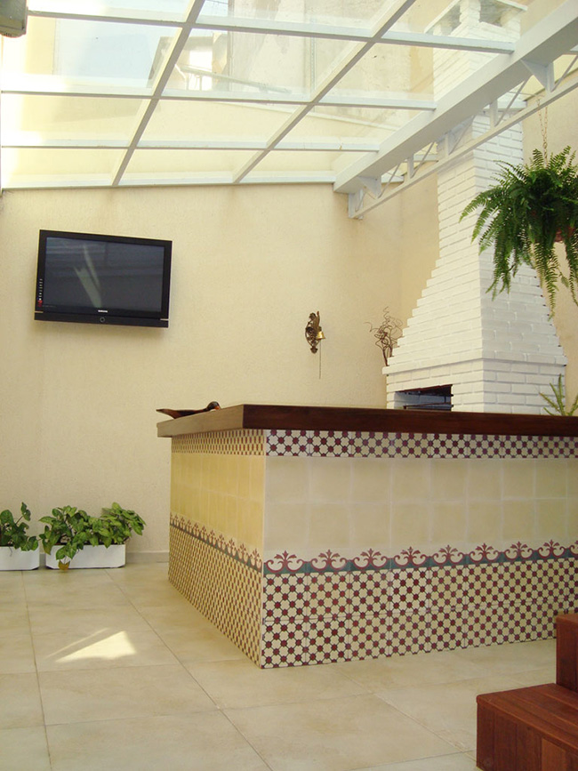 Pergolado metálico com cobertura de vidro. Projeto da arquiteta Fernanda Polizelli Hoffmann.