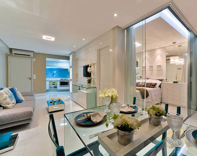 A divisão entre o quarto e a sala de estar é feita por lâminas de vidro. No quarto, prateleiras iluminadas de vidro e lustre do mesmo material. A mesa de jantar e cadeiras também são de vidro. Projeto da arquiteta Fernanda de Lima.