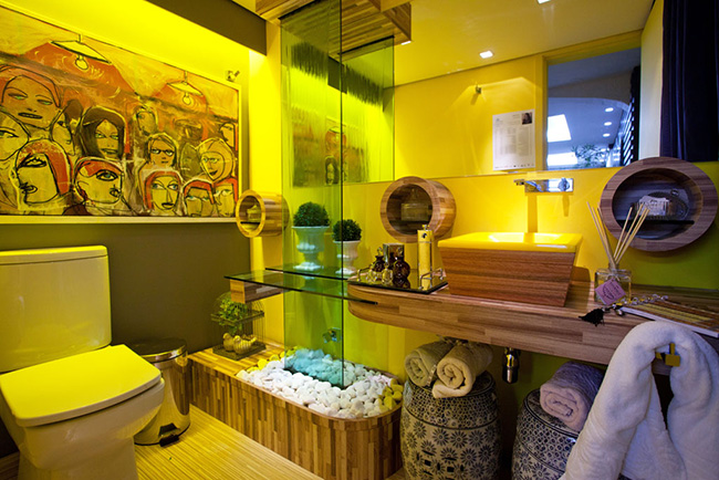 Uma aconchegante cortina d’água transpassa a bancada com detalhes em vidro para dar suavidade e transparência. Os elementos naturais – madeira e água – deram o toque final. Projeto da arquiteta Fernanda Manata.
