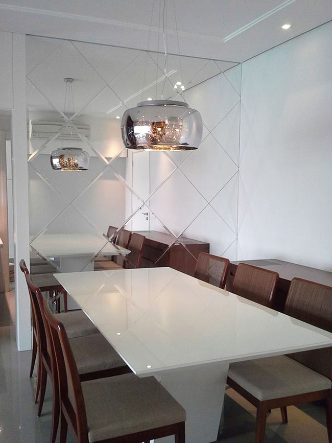 Nesta sala, para dar amplitude, claridade e elegância, foram instalados espelhos na diagonal, bisotados. Projeto do engenheiro Julio Pinto.