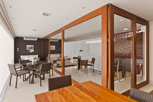 Neste projeto da arquiteta Fernanda Lima em Salvador, a mesa de jantar e cadeiras são de vidro e possibilitam a melhor visão para o mar.