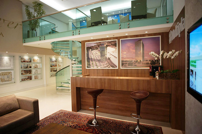 Showroom de vendas de prédio comercial em Porto Alegre, RS. Detalhe: escada toda em vidro. Projeto da arquiteta Máira Ritter.