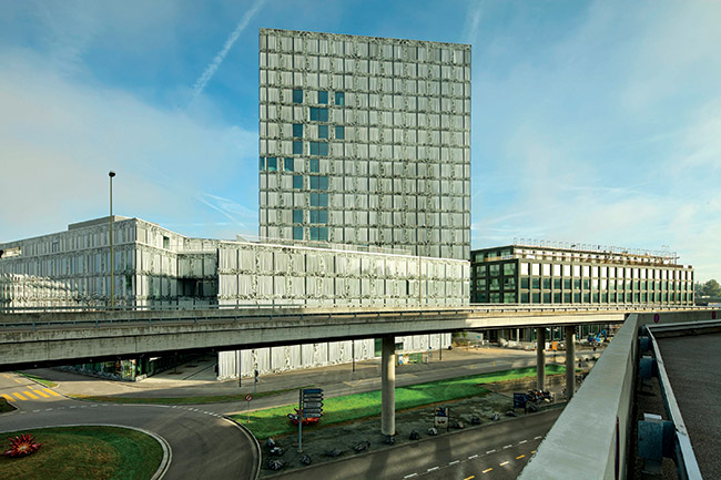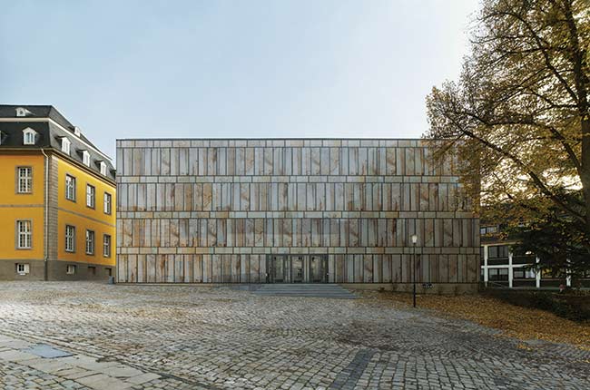 Com um dos maiores acervos de música da Alemanha, incluindo partituras, registros sonoros, livros e imagens, a Universidade de Artes Folkwang precisava de um edifício que protegesse a coleção do excesso de exposição à radiação solar. Foi com essa premissa em mente que o arquiteto Max Dudler concebeu o projeto da Biblioteca Folkwang. A inusitada solução adotada envolveu a criação de uma fachada integralmente envidraçada, que imita formato e textura de pedra. Os 600 painéis receberam diferentes padrões digitalmente impressos, capazes de reproduzir com precisão o aspecto desejado. O envelopamento protege o acervo e garante penetração parcial de luz, ao mesmo tempo em que confere ao prédio uma identidade capaz de dialogar com os demais edifícios no campus. Os vidros foram fornecidos pela Saint-Gobain Glass