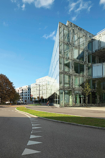 O novo plano diretor da cidade foi o fator principal a determinar o padrão serigráfico a ser adotado na sede da Allianz na Suíça. Segundo o plano, todas as edificações deveriam ter suas fachadas revestidas por pedras naturais. Os arquitetos do Wiel Arets tiveram então a ideia de usar uma pele de vidro com padrão abstrato de mármore Onyx, permitindo à construção misturar-se com seu contexto, sem com isso abrir mão de uma aparência distinta. Composto por uma torre, um anexo e quatro pontes verticais conectando cada volume, o edifício cria um desenho único em meio à paisagem da cidade. Cada elemento da fachada contém um sistema de cavidade fechada, no qual foi instalada uma cortina prateada revestida de liga de alumínio, que promove uma variação no grau de sombreamento de acordo com as condições ambientais externas.