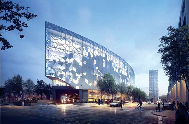 Com o intuito de materializar um espaço público de alta tecnologia voltado para atividades de pesquisa e inovação, o escritório Snohetta concebeu um projeto vibrante, que pudesse abraçar a diversidade urbana e cultural de uma cidade em plena expansão. Em uma geometria única, a fachada da biblioteca combina vidros translúcidos incolores com chapas serigrafadas opacas para controlar a entrada de luz solar e os níveis de claridade em cada ambiente. Assim, zonas de máxima transparência atraem a atenção do público para as atividades internas, enquanto áreas mais fechadas promovem espaços mais introspectivos para leitura e estudo.