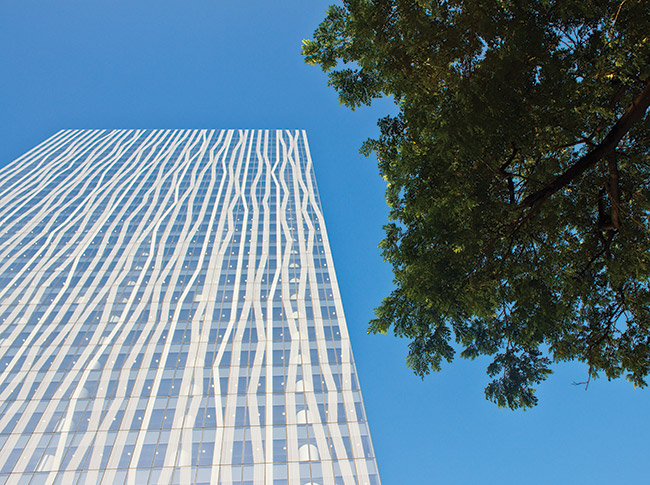 Edifício de uso misto, o Zuellig Bulding é um verdadeiro marco arquitetônico de Manila. Assinada pelo escritório SOM, sua fachada cortina exibe um padrão de frita cerâmica capaz de conferir ao projeto uma identidade marcante e uma estética singular. Os painéis duplos de vidro low-e atuam em conjunto com o sombreamento promovido pelos padrões serigráficos para garantir taxas mínimas de ganho solar e perda de energia, ao mesmo tempo em que permitem inundar de luz natural 90% do espaço dos escritórios. O desenho adotado foi inspirado em temas orgânicos locais como o bambu e o fluxo da água, e também cumpre a função de reforçar o aspecto vertical da torre. O edifício foi o primeiro das Filipinas a receber a certificação Leed Gold, concedida pelo U.S. Green Building Council.
