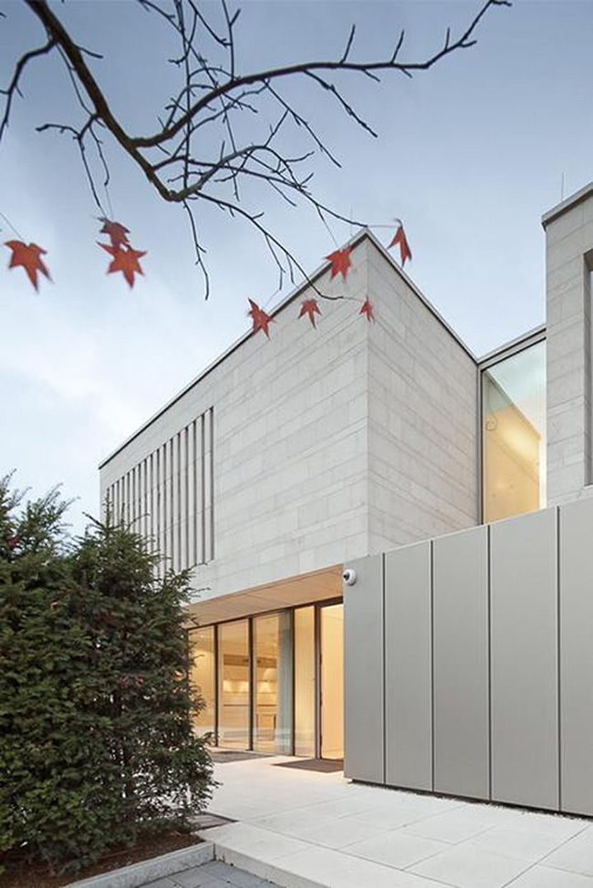 O piso térreo, feito em vidro e alumínio, contrasta com o nível superior, que é revestido em pedra natural de cor clara. O projeto, da XYZ Designers , permite uma amplitude e integração com o jardim, permitindo que áreas interior e exterior para se fundem. Já a fachada que dá para a rua é mais fechada, a fim de cumprir o desejo do cliente de proteger dos espectadores não convidados.