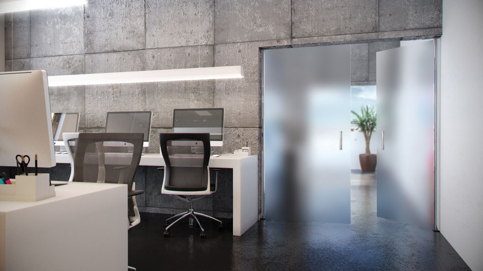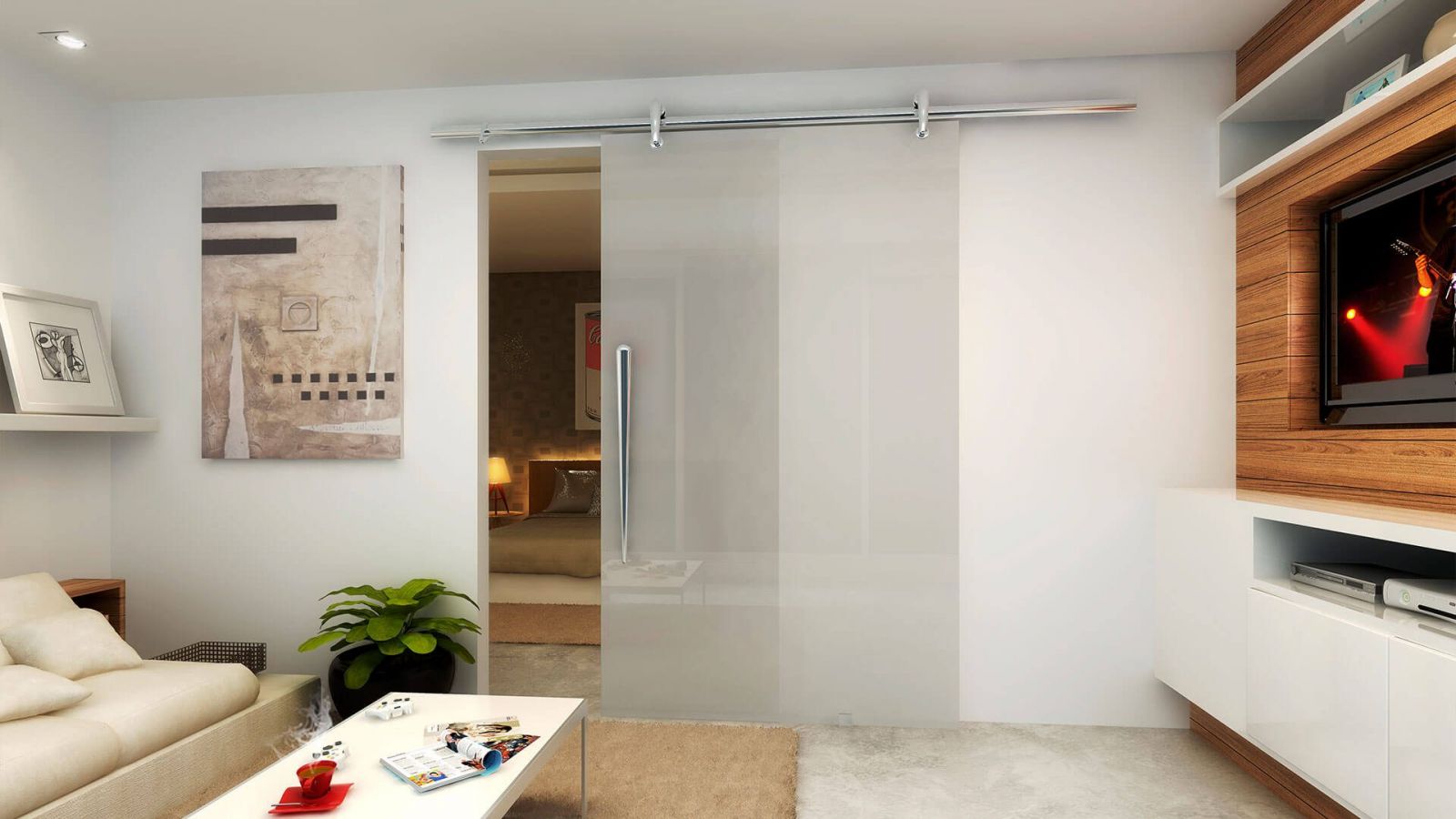 A Porta Certa é um sistema inovador que facilita a instalação, já que dispensa furos, e ainda deixa o ambiente muito mais clean sem o perfil superior e inferior.