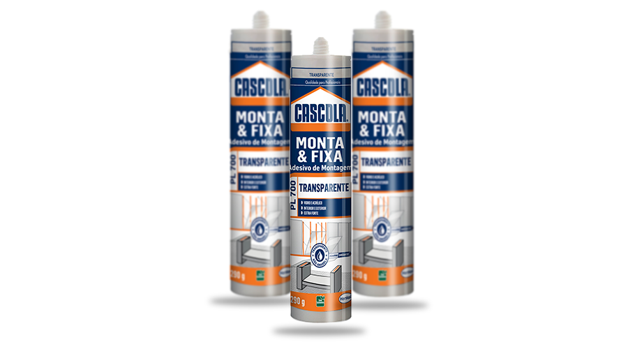 Cascola Monta & Fixa PL 700 Transparente: É um adesivo de montagem transparente com agarre imediato e alta força de colagem, especialmente desenvolvido para aplicações com acabamento transparente. Com exclusiva tecnologia Flextec®, o produto é resistente a intempéries, sendo aplicável em superfícies molhadas e utilizado em ambientes internos e externos. Livre de solventes e resistente aos raios UV, não amarela e adere a uma grande variedade de materiais. É especialmente indicado para fixação de painéis de vidro, tampos de mesa, elementos decorativos, peças em acrílico, revestimentos em vidro e bancadas de vidro. Adere a uma ampla variedade de materiais, como: vidro, metal, madeira, concreto, azulejo, mármore, granito, entre outros.
