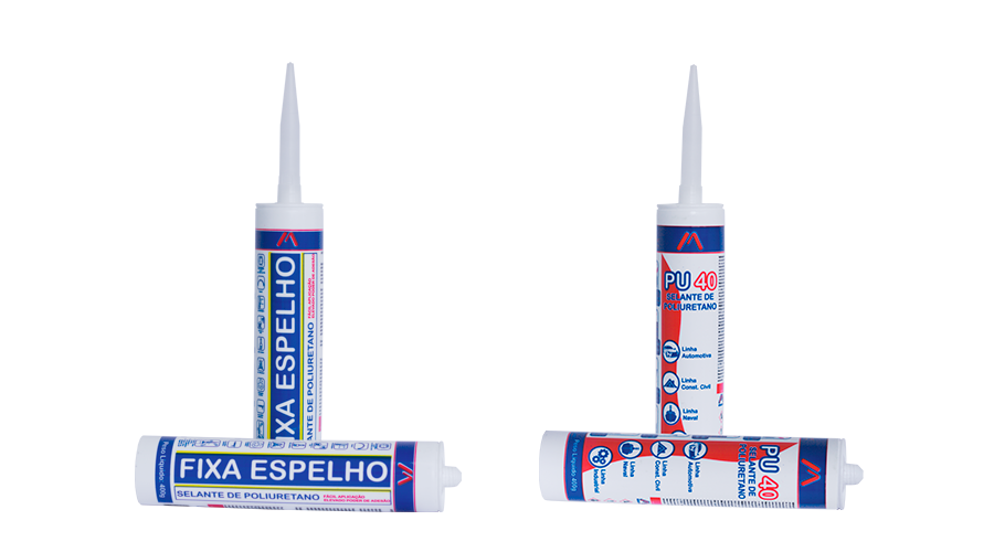 Pu40: Adesivo a base de poliuretano híbrido monocomponente, cargas minerais e aditivos, apresenta secagem rápida para diversas aplicações como box, sacadas e vidros em geral. Possui proteção UV, alta durabilidade e elasticidade permanente. É um material de fácil aplicação, feita com pistola manual ou pneumática, e aceita pintura após aplicado. O produto cura ao entrar em contato com a umidade do ar formando um elastômero de alta resistência mecânica e a intempéries.