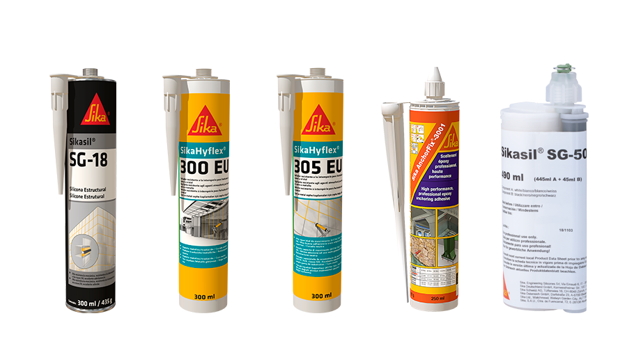 Sikasil® SG-18: É um silicone de cura neutra com excelente adesão a uma grande variedade de substratos. Atende aos requisitos da EOTA ETAG 002, EM 13022 e ASTM C1184, possui altíssima resistência UV e às intempéries, com uma boa adesão em vidros, metais e metais revestidos.