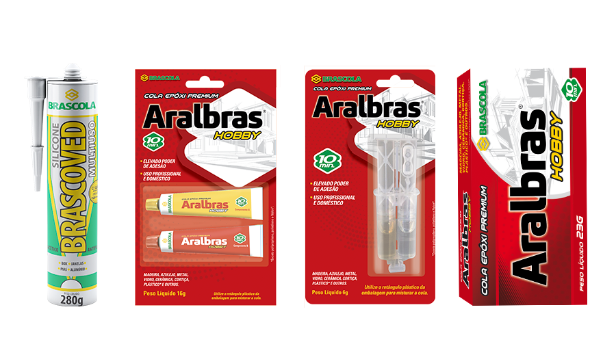 Aralbras Hobby 10 min.: Adesivo bicomponente à base de resina epóxi. Indicado para reparos domésticos, artesanato e indústria. Fixa e cola diversos materiais lisos, porosos ou irregulares, como azulejos, madeira, vidro, concreto, a maioria dos plásticos, customização de chinelos e outros. Possui altíssima resistência, até 70ºC, secagem em 10 minutos e cura total em 8 horas.