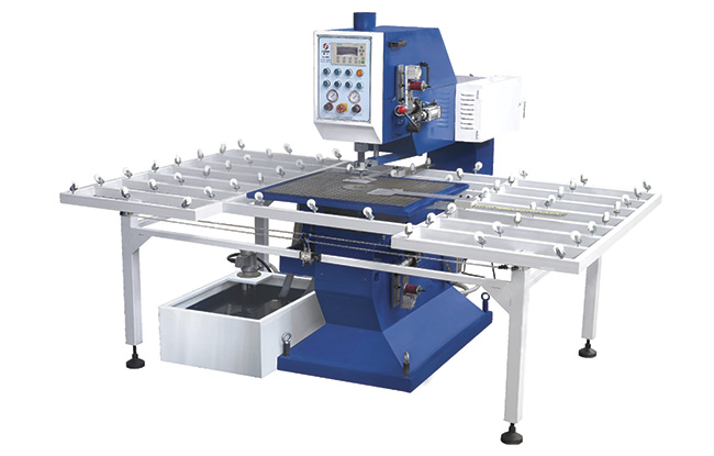 O equipamento é composto por um conjunto de três furadeiras, associado à mesa pneumática USE-MP 06. Com estrutura robusta, em aço carbono, combina perfuração pneumática, executada pela broca inferior, e perfuração manual, executada pela broca superior. Com travamento automático do vidro, o equipamento requer pressão de ar de 5 a 6 bar, e é projetado para furar vidros com facilidade. Comporta brocas de até 150 mm e executa furos em vidros de espessura entre 3 e 25 mm. Com mesa de alumínio e adaptador de latão no eixo principal, a máquina é dotada de conector giratório d’água para resfriamento da broca e controle eletrônico de velocidade da broca superior, além de sistema de reaproveitamento de água. A distância útil é de 1500 mm e a potência máxima instalada é de 6,00 KVA.