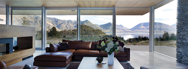 Na Nova Zelândia, os designers do Fat Hippo Design Group usaram vidros duplos de tom esverdeado para potencializar a beleza visual da água e da neve ao longo das estações. Em plena comunhão com o cenário ao redor, a casa de férias é transparente nas faces frontal e traseira, permitindo que se contemple a vista através dela. Instaladas em esquadrias de alumínio, as chapas são fixas na fundação de concreto abaixo do nível do chão