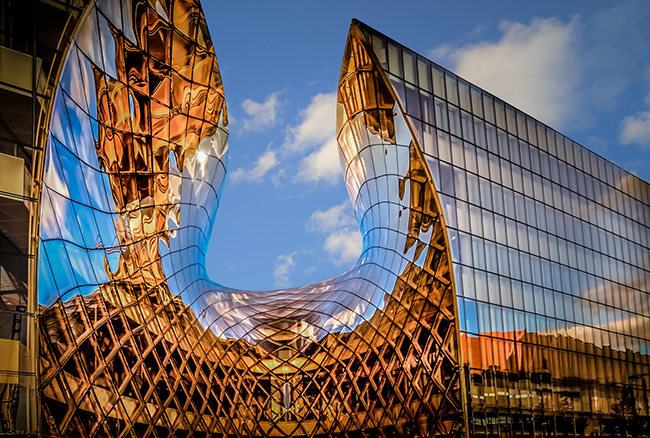 O predio é todo feito de vidro e combina curvas muito acentuadas aos reflexos das diferentes luzes que batem em suas paredes ao longo do dia e noite.