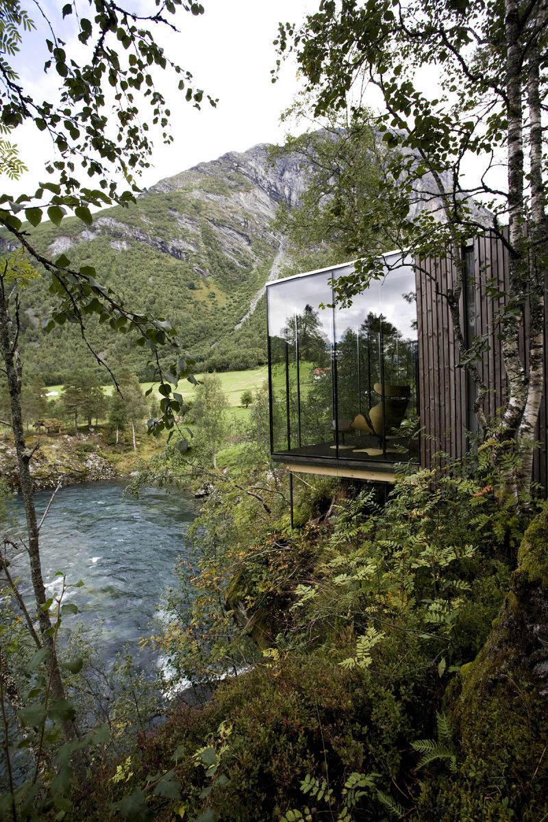 Paredes construídas inteiramente de vidro em ambientes e quartos do Hotel Juvet, na Noruega, fazem com que os hóspedes se sintam inseridos no meio ambiente e desfrutem de locais que seriam proibidos por questões de preservação