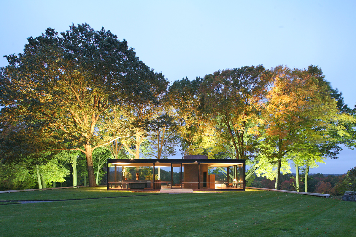 Invisível da estrada, a Glass House tem vista para um lago e um bosque, vislumbrando uma área verde no horizonte de New Canaan, no estado norte-americano de Connecticut. Com 55 metros de comprimento e 33 metros de largura, cada uma das quatro paredes exteriores é pontuada por uma porta de vidro centralizada que se abre para a paisagem. A casa tornou-se um ícone da arquitetura americana pelo uso inovador de materiais e sua integração sem costuras na paisagem.