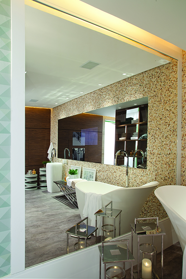 Dividido em quarto com cama de casal de um lado e sala de banho do outro, o atelier teve suas paredes revestidas com espelhos de 4 mm, instalados pela Silvestre Vidros e beneficiados pela CNV Vidros.