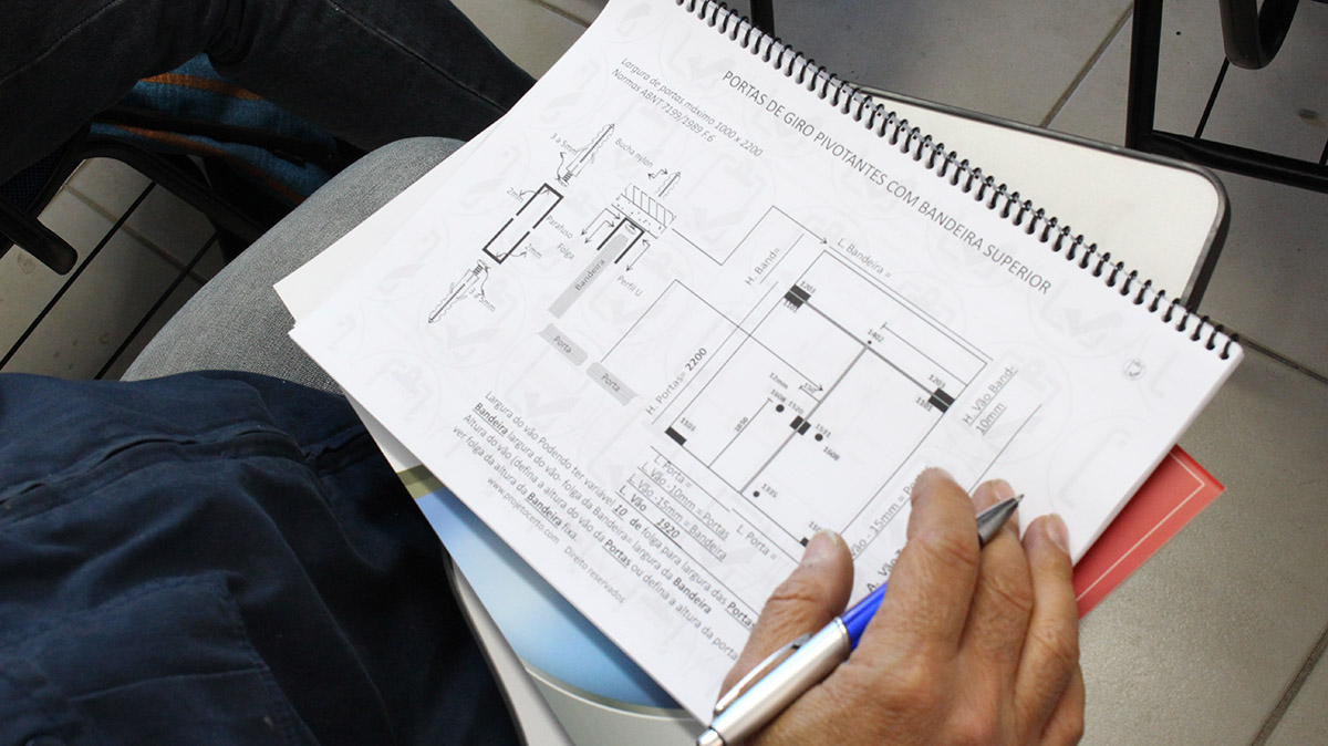 No meu curso de Projetos, Medidas e Folgas, antes da aula faço um questionário para entender o nível de cada aluno e direcionar a aula corretamente. Muitos ainda não têm segurança em fazer os cálculos, não é só medir, o profissional se sente seguro e erra muitas vezes, acontecem muitas falhas por erros de contas. A autoconfiança demais atrapalha, se você não sabe fazer o projeto, não vai saber o que pode instalar. Para isso, é preciso também conhecer as normas para saber quando especificar um vidro laminado, por exemplo. Na apostila do curso também coloco as partes mais importantes das normas técnicas em uma linguagem mais clara e didática.