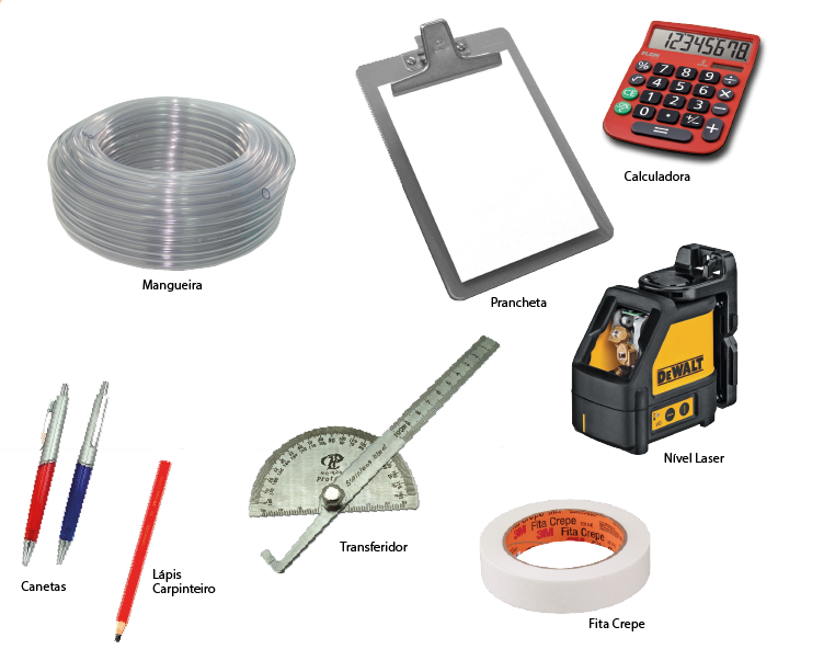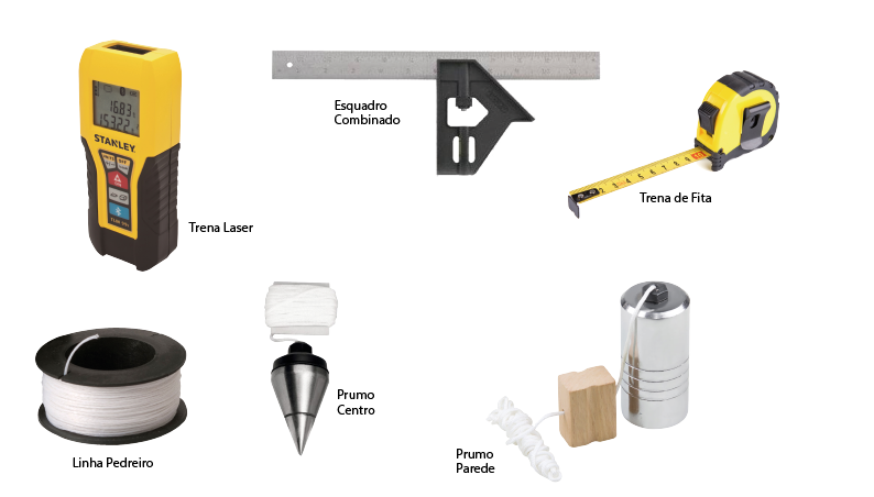 Ao visitar o cliente para fazer as medidas, tenha em mãos os seguintes itens: prancheta para apoiar a folha A4, folha com a logomarca da empresa, lapiseira 0,9, lápis de carpinteiro, caneta esferográfica azul para fazer anotações gerais, caneta vermelha para anotar os detalhes, trena fita ou digital, prumo de encosto (com ele você encontra o lado do vão que está fora de prumo) e prumo de centro (ajuda a encontrar o eixo de vãos fora de esquadro), fita crepe (para realizar marcações na parede sem riscá-la). Vale ressaltar que ferramentas de qualidade são essenciais, utilize apenas ferramentas aferidas. Há trenas de má qualidade que interferem no resultado do trabalho, assim como outros instrumentos.
