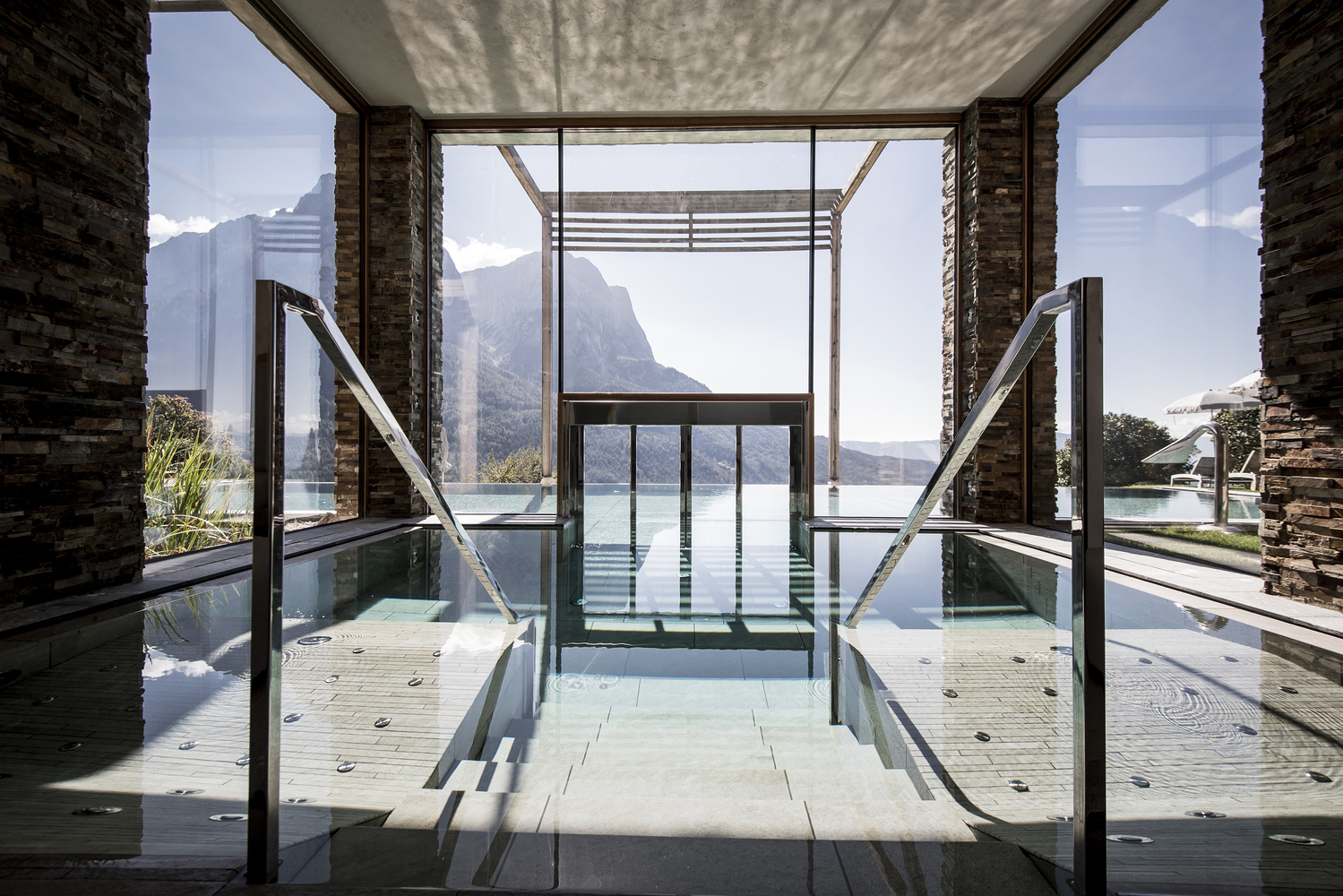 O objetivo do conceito arquitetônico foi sublinhar e reforçar a impressionante paisagem alpina circundante através da inserção de vidro proporcionando harmonia com a paisagem natural. Ao mesmo tempo, a vista, o panorama e a silhueta da montanha continuam sendo o ponto focal. O hotel alcançou um atributo significativo para sua nova identidade através da criação da nova área de estar; o elemento da água torna-se parte integrada do conceito de arquitetura, design de interiores, assim de todos os produtos e móveis.