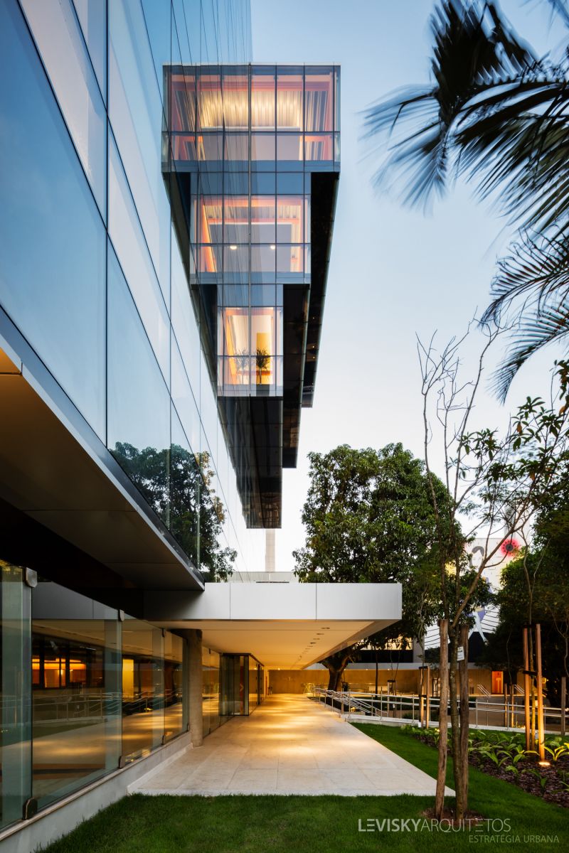A fachada frontal é composta de esquadrias com montantes de alumínio, preenchidos com lã de rocha e vidros laminados 13 mm, com PVB acústico (6 mm low-e na face 2 + PVB acústico S-Lecsaf + 6 mm). O bloco principal conta, ainda, com sistema de fachada ventilada composta por um grande mosaico com placas de agregado cimentício e de material reciclado, com janelas de vidro duplo (4+6 mm low-e na face 2 + 20 mm fr câmara de ar + 4+4 mm vidro float) e micro persianas (38mm) embutidas na caixilharia.
