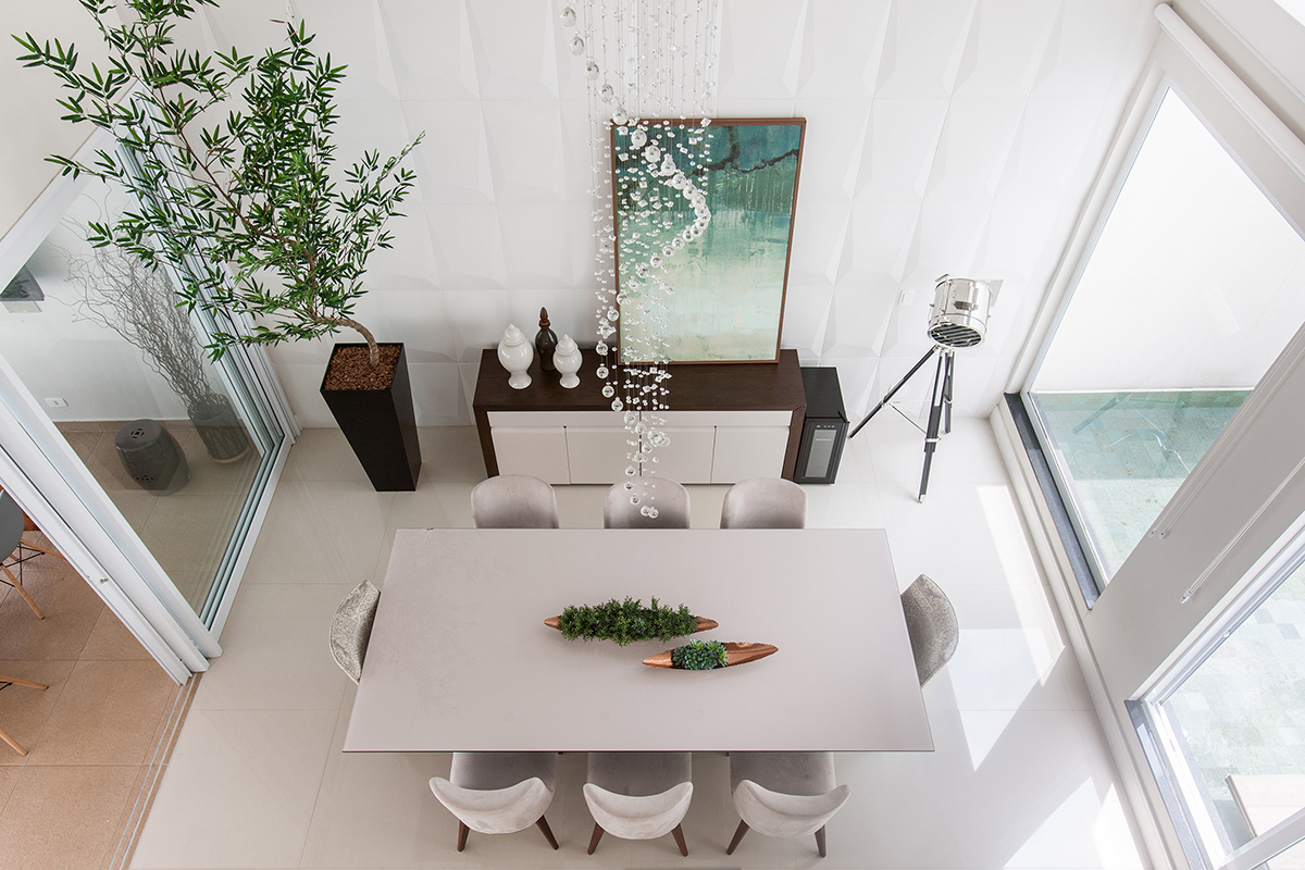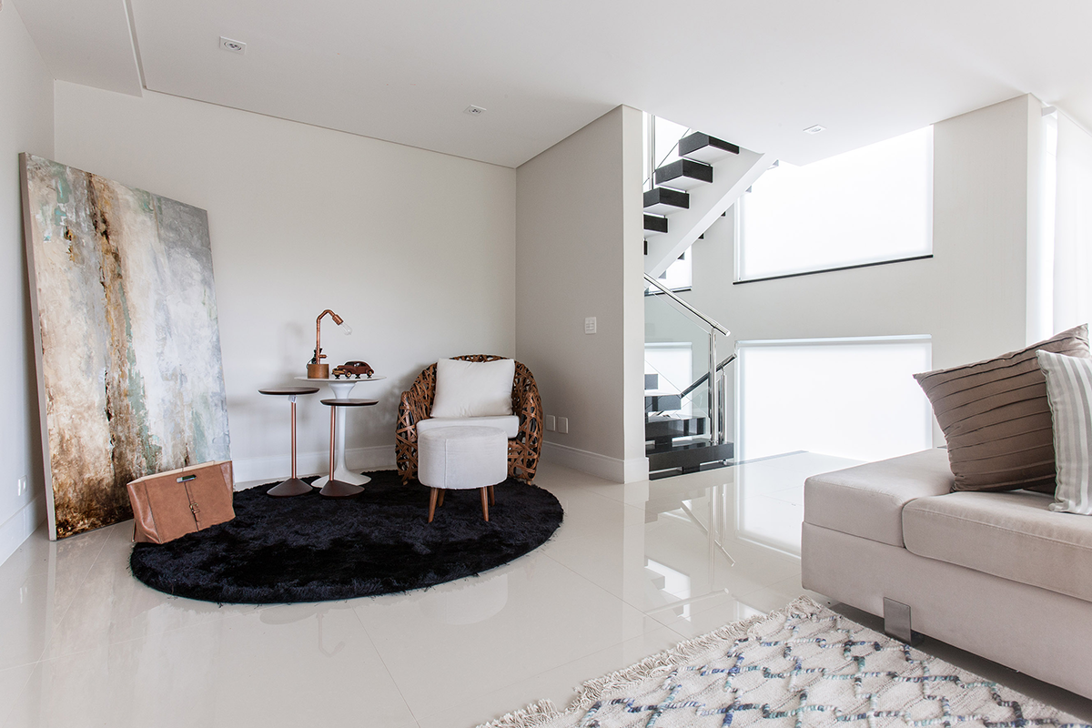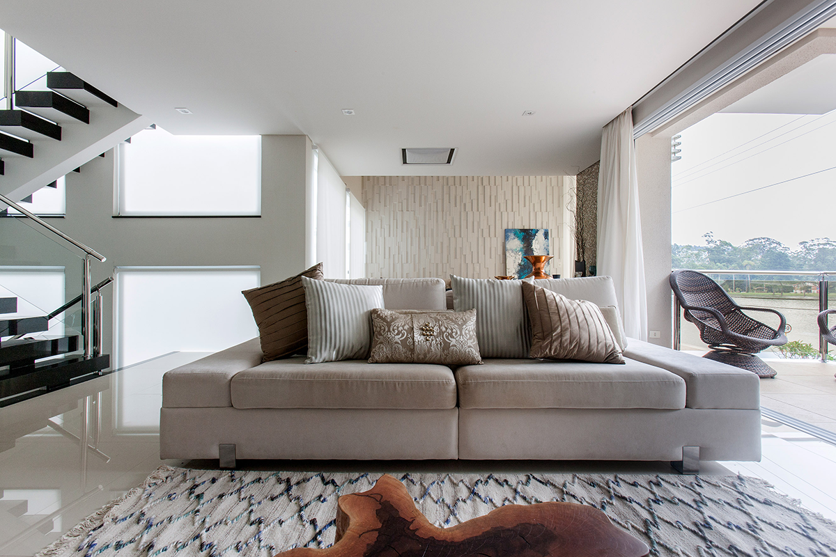 Incorporar a iluminação natural nos ambientes foi um dos principais propósitos do projeto da residência de cerca de 400m² localizada em um residencial de luxo em São Bernardo do Campo (SP), pedido atendido com a inclusão de grandes janelas e fechamentos em vidro por quase toda sua extensão, que deram ainda a sensação de amplitude e uma vista privilegiada para o lago do condomínio e áreas verdes do entorno, ainda que sem prejudicar ou interferir na paisagem interna. Este também era um dos objetivos dos clientes, criar ambientes setorizados com fácil transição entre eles, mas sem integração total, valorizando a privacidade nos locais mais íntimos.