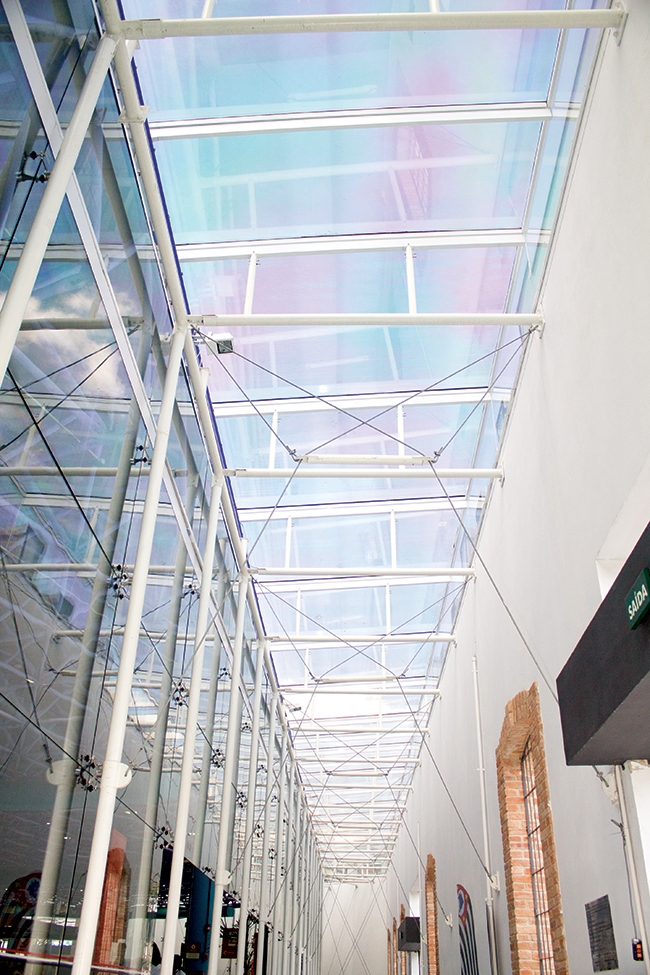 Outra demanda é quando o vidro precisa ser utilizado sem o apoio de perfis, como em algumas obras históricas que permitem certa intervenção arquitetônica com o mínimo de interferência no projeto original. Nestes casos, a tecnologia mais utilizada tem sido o vidro temperado-laminado extra claro com película de polivinil butiral (PVB) ou resina ionomérica, que chega a ser 100 vezes mais rígida que o PVB, de modo a possibilitar panos de vidro maiores, com o mínimo de perfis de sustentação, mantendo o máximo possível da estética original do local”.