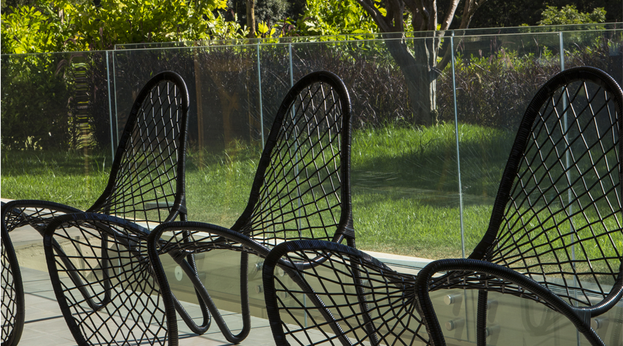 Os grandes painéis de correr foram feitos com esquadrias de alumínio e vidros transparentes temperados e laminados com película PVB anti raios U.