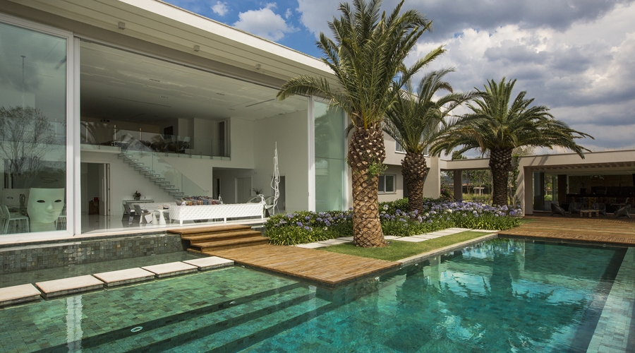 O projeto do arquiteto Léo Shehtman ainda é todo integrado e com pé direito triplo, o que proporciona também muita ventilação natural. Os grandes painéis de correr foram feitos com esquadrias de alumínio e vidros transparentes temperados e laminados com película PVB anti raios UV.