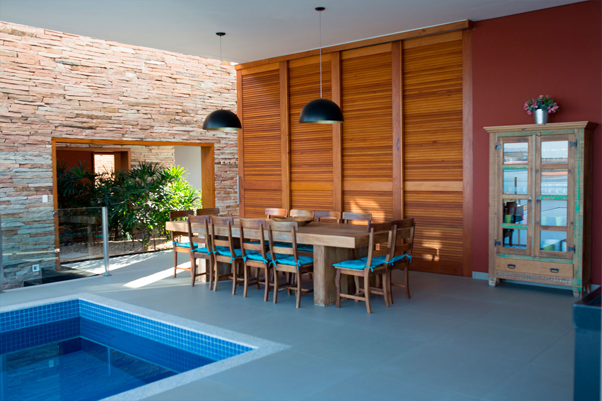 Na área da piscina uma porta de vidro flexível permite o fechamento e abertura para a área externa de acordo com a necessidade dos usuários. “O objetivo foi evitar criar um espaço gourmet separado da casa. Quando aberta, a piscina transforma o espaço de sala em varanda coberta, com toda a utilidade de cozinha, mesa de jantar”, conta Gabriel Souza, arquiteto do projeto. No visor da piscina foi necessário empregar duas chapas de laminados com espessura de 10 mm cada para suportar a pressão da água sem trincar.