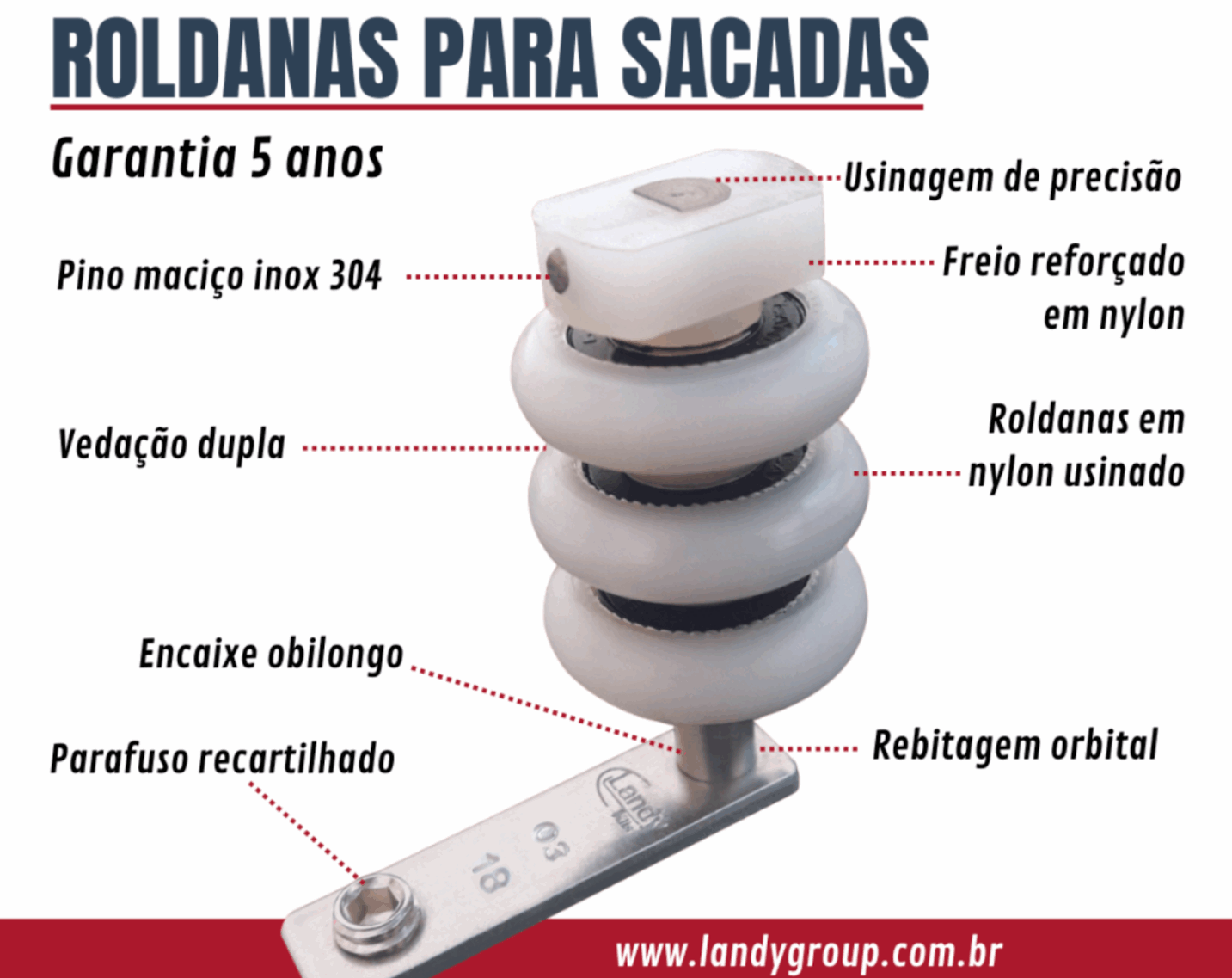Cada roldana é marcada com a logomarca Landy Kits estampada na chapa de fixação, além do lote e data gravados — o que assegura rastreabilidade e proteção contra falsificações. Esses detalhes dão ao instalador e ao consumidor a garantia de que estão adquirindo um produto original, com desempenho comprovado.