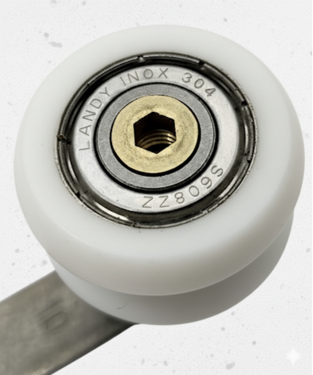 • Kit de Roldanas 100% Inox com ajuste/regulagem – desenvolvido especialmente para regiões litorâneas, onde a maresia é um desafio constante. Esse modelo garante máxima resistência à oxidação, evitando corrosões e prolongando a vida útil da sacada.