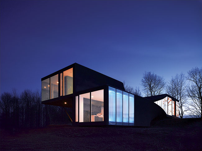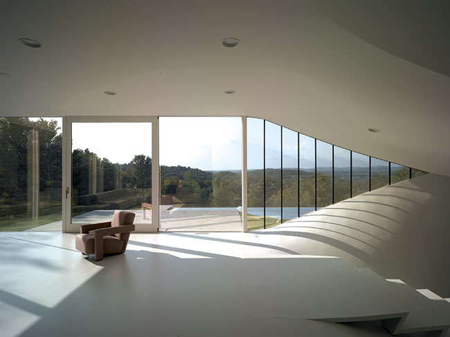 Para se adaptar ao terreno em dois níveis, o recurso predominante nos espaços internos consiste em criar superfícies fluidas e dinâmicas. Algumas paredes são torcidas em seu eixo horizontal, convertendo-se em uma parcela do piso superior. “As paredes se curvam e se transformam em pisos, que fluem e voltam a se transformar em paredes”, diz o arquiteto.