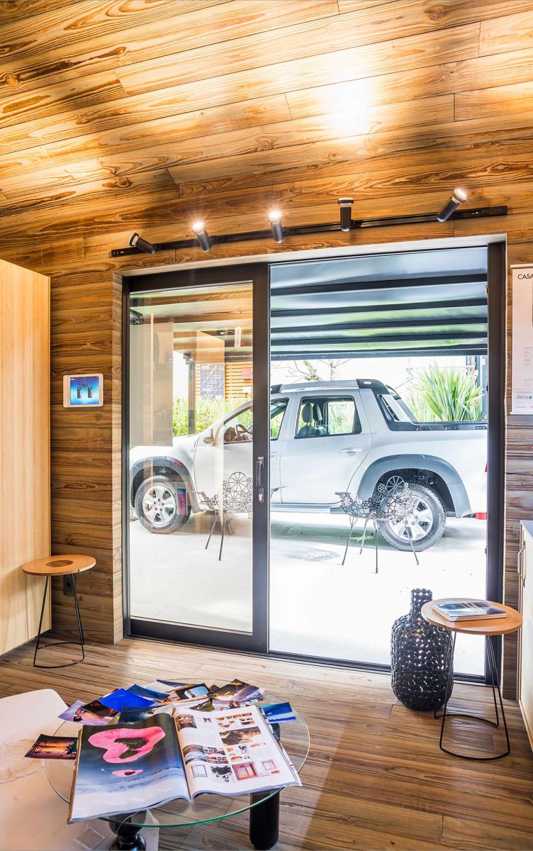 Para expor o modelo de carro Guster Oroch, da Renault, os arquitetos Marchetti Bonetti, Tais Adriana Marchetti Bonetti e Giovani Bonetti criaram o espaço Cabana Renault. O Habitat Neutro Incolor foi aplicado no envidraçamento que permite a visualização do automóvel, agregando na proposta de uma habitação compacta, o que reflete identidade aventureira e criativa do veículo.