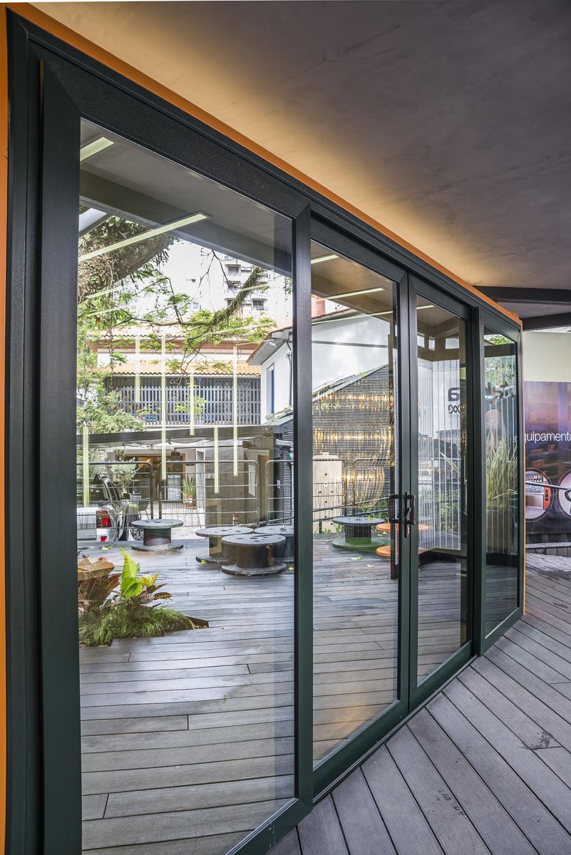 Por fim, o Habitat Refletivo Verde foi aplicado no Lounge Jota Jota. As portas envidraçadas com aspecto refletivo assinadas pelas arquitetas Caroline Mocelin e Patrícia Moschen trouxeram mais privacidade para o ambiente do contêiner. A estética do vidro também combinou com a decoração composta por instalação dos tubos, conexões hidráulicas, fios elétricos e bobinas de fio, elementos que foram expostos de forma diferente, criando uma identidade urbana para o Lounge.