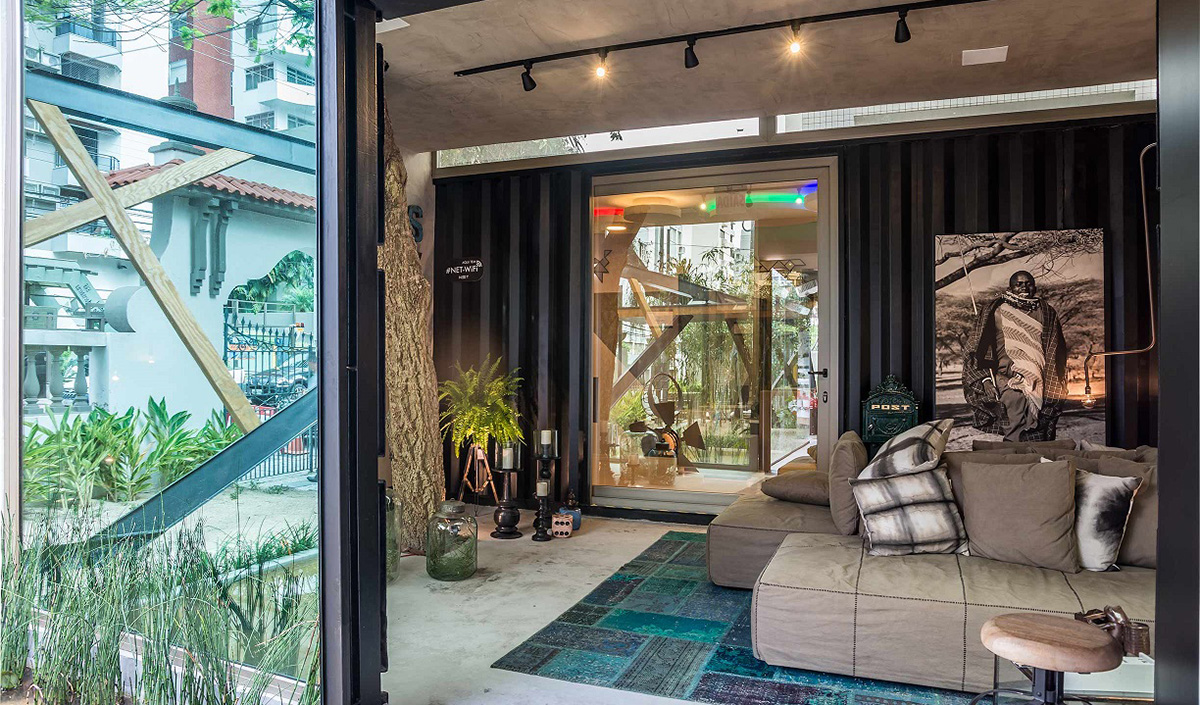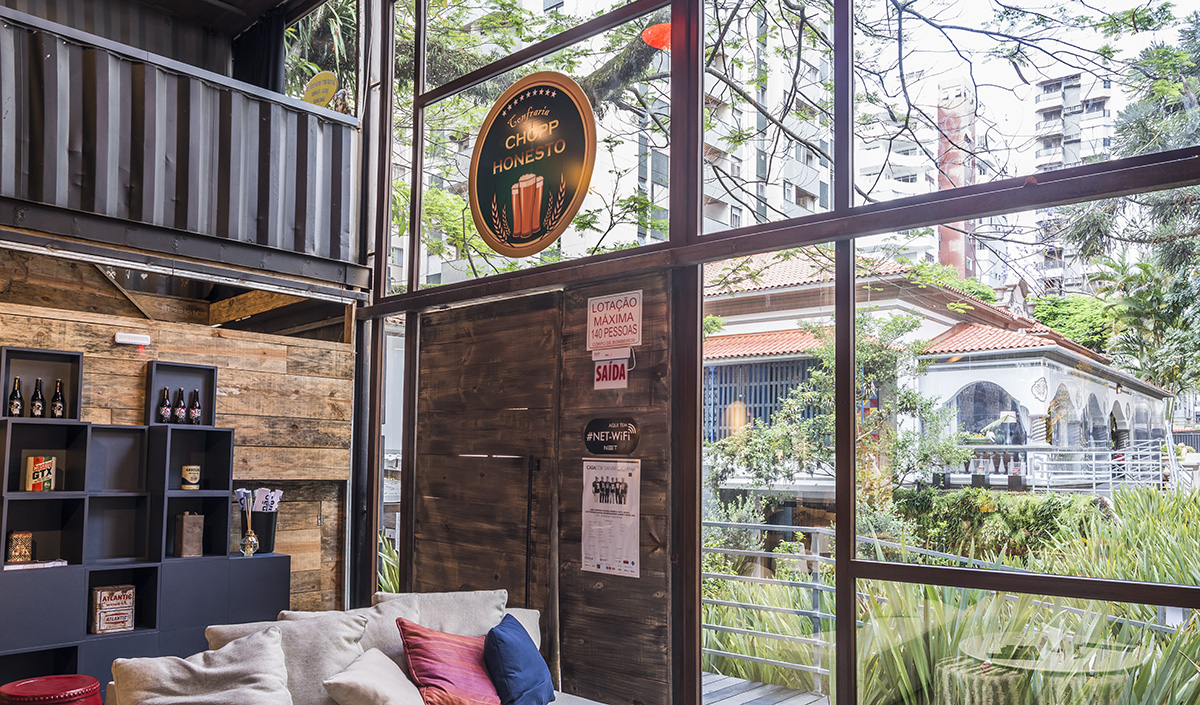 Já o Pub Confraria do Chopp Honesto, dos arquitetos Ricardo Fonseca, Mário Pinheiro, Beto Gebara, Luiz Fernando Zanoni e André Lima, é formado por quatro contêineres e traz a aplicação do Habitat Refletivo Cinza em suas janelas. Por ser um vidro de tonalidade escura e espelhado, o resultado é uma alta privacidade e mais modernidade para o Pub CCH. As texturas diversas e decoração rústica resultaram em uma atmosfera de total descontração para o espaço.