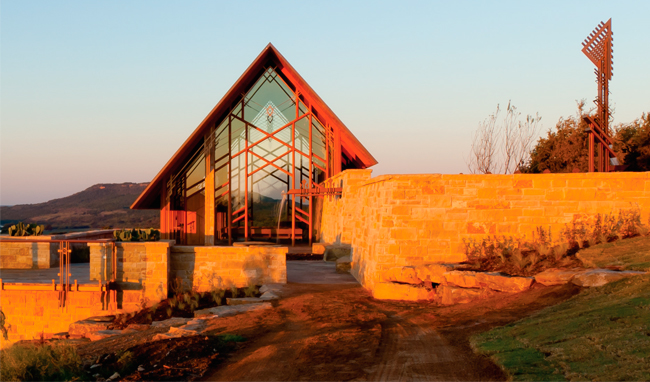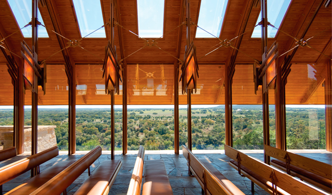 Marcada pela transparência e constituída basicamente por madeira, pedra e vidro, a Capela Rio Roca acomoda um máximo de 50 pessoas por vez, em um espaço de aproximadamente 100 m2. A pitoresca edificação está localizada no pequeno Condado de Palo Pinto, no Texas, com uma população de menos de 30 mil habitantes. Finalizada em 2010, sua estrutura foi minuciosamente articulada em vigas de madeira que, acopladas a opulentas texturas, definem o formato em A da construção, enquadrando a estonteante paisagem da região. “A leve estrutura de madeira é sutilmente abraçada por barras e braços de tensão, responsáveis pela fi xação e suporte das paredes e do telhado de cobre”, descreve o arquiteto Walter Jennings, sócio do escritório criador do projeto.