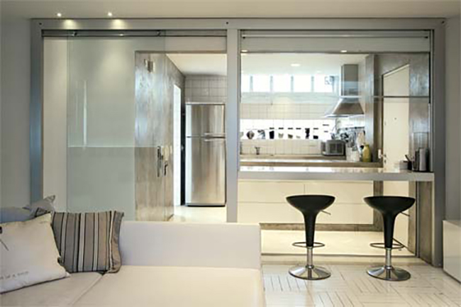 Sem fronteiras. A junção cozinha + sala não é definida apenas pelo tamanho de uma residência, mas também o quanto os ambientes estão compartimentados ou integrados entre si. Além de tornar o ambiente mais agradável, o vidro proporciona amplitude aos ambientes