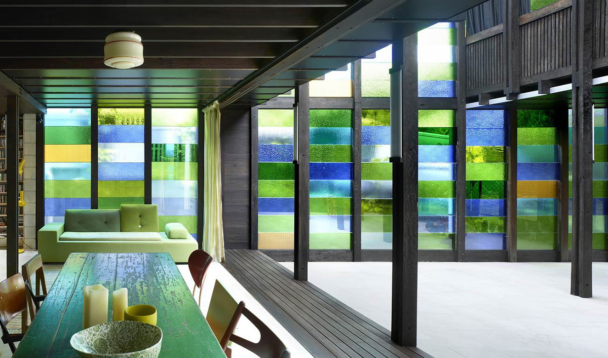 O arquiteto de James Russell escolheu usar o vidro colorido tradicional combinado a outros elementos para criar um ambiente acolhedor com cores e texturas em uma residência na Austrália. As cores em tons de verde e azul contrastam com as cores frias do ambiente e o piso laminado pálido. A adição de cadeiras nostálgicas e arte lunática permitem que a sala tenha uma vibração que é reforçada pelo vidro colorido na parede oposta, que adiciona charme ao espaço e define a identidade do projeto.