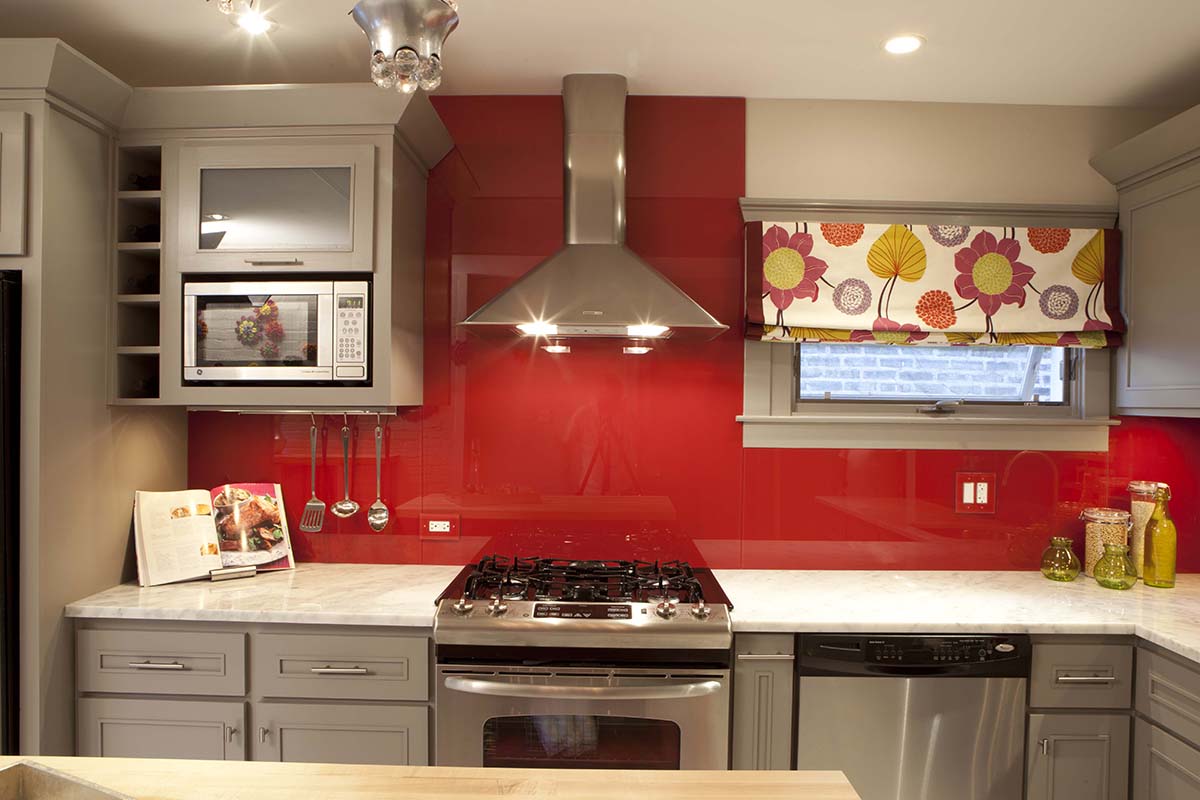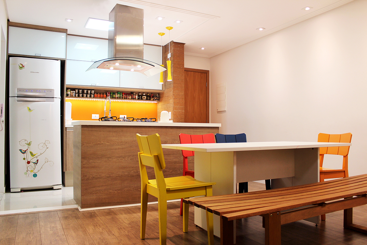 Neste apartamento em São Paulo, a arquiteta Pammela Resende Menezes utilizou vidro colorido amarelo 10mm para revestir a parede da pia. “Não queríamos rejunte e emenda acima da pia, por isso usamos uma chapa inteira de vidro pintado. Nesta cozinha queríamos fazer algo alegre, então os móveis ficaram coloridos também”, explica.