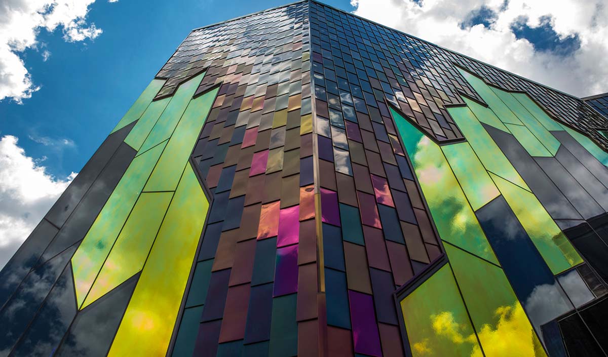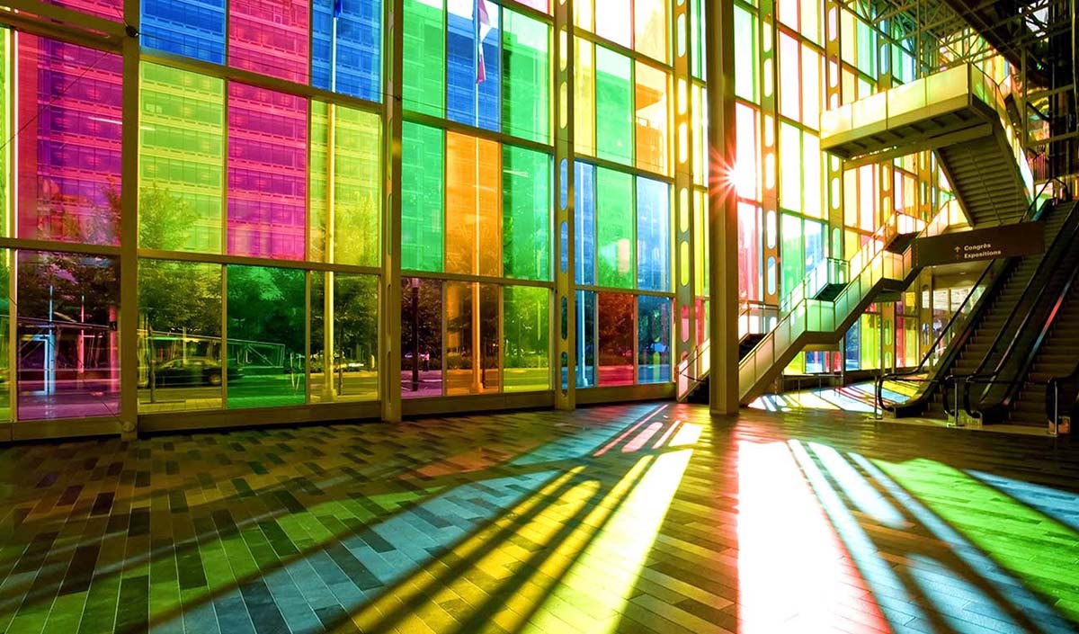 O Palais des Congrès em Montreal, no Canadá, chama atenção por sua enorme fachada com vidro colorido, que traz vida ao bairro histórico onde está inserido. Embora seja típico da arquitetura moderna conectar espaços interiores e exteriores com a transparência do vidro, o design Hal Ingberg desenvolveu um novo conceito que traz essa interatividade com a sensação mínima de opacidade do vidro ao mesmo tempo que cria uma divisão dos espaços por meio de uma camada colorida, estabelecendo visualmente mundos paralelos. Os vidros coloridos ainda permitem a passagem da iluminação solar, traçando feixes de luz em diversas cores no interior do palácio.