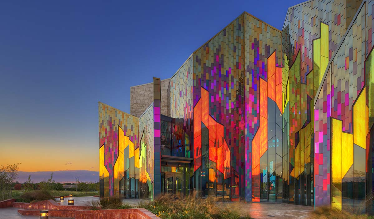 O conceito do edifício Museum at Prairiefire, localizado em Kansas, nos Estados Unidos, é reproduzir a paisagem de uma pradaria, especialmente o fogo da queima de sua vegetação. A fachada do edifício, criada pelo escritório Verner Johnson, é feita com vidro dicróico em cores diversas e painéis de aço inoxidável, formando uma composição que invoca chamas de fogo. Os vidros ainda mudam de cor conforme a iluminação, criando uma visualização vibrante, com cores variáveis e brilho ao redor do edifício.