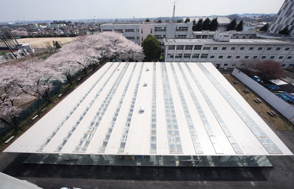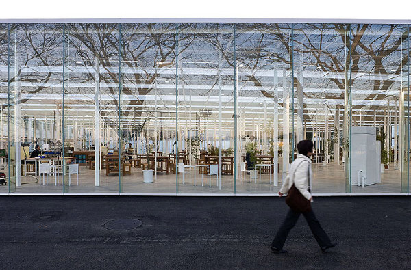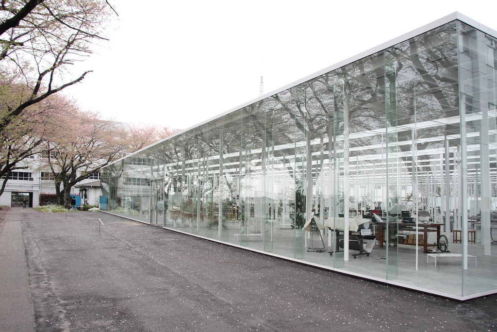 O Instituto de Tecnologia de Kanagawa, no Japão, é uma construção feita só com paredes de vidro, cujo telhado é sustentado por 305 pilares brancos dispostos no interior de forma aparentemente aleatória, evitando a repetição de ângulos.
