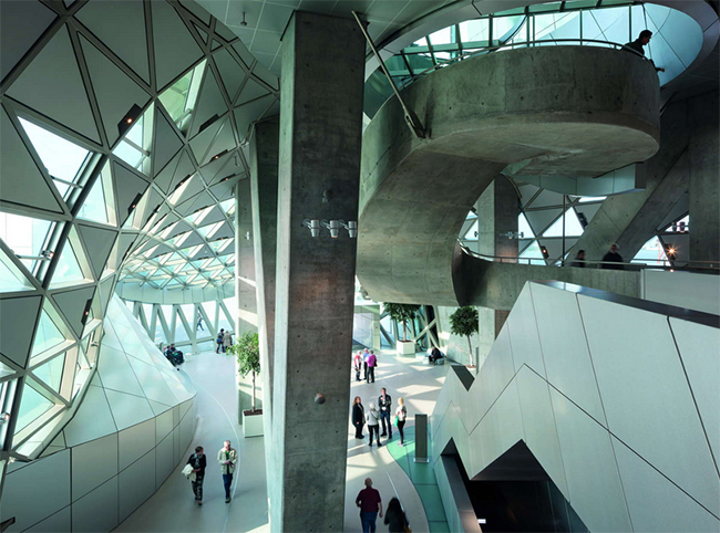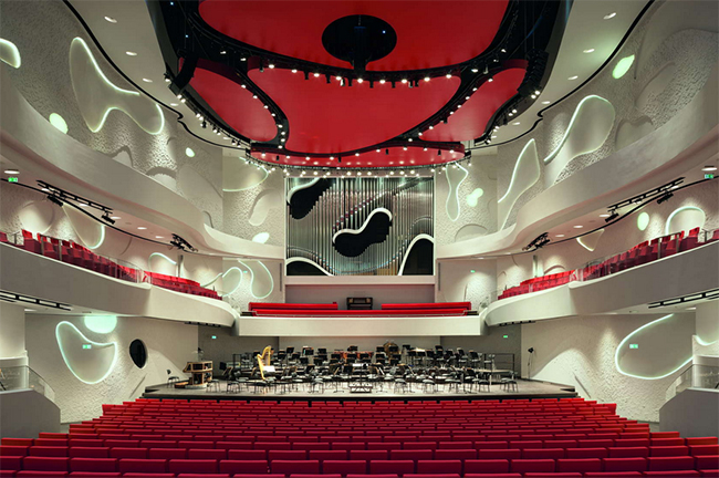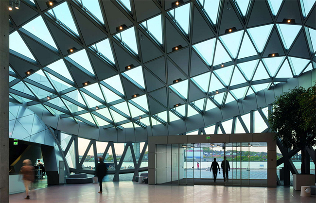 O projeto da Casa da Música em Aalborg, na Dinamarca, se destaca pelo contorno em curvilíneo em vidros com formas geométricas, trazendo uma vista impresionante. A forte presença do vidro cria um intercâmbio entre os ambientes. Além disso, o edifício conta com uma experiência acústica ideal e um rojeto de eficiência energética.