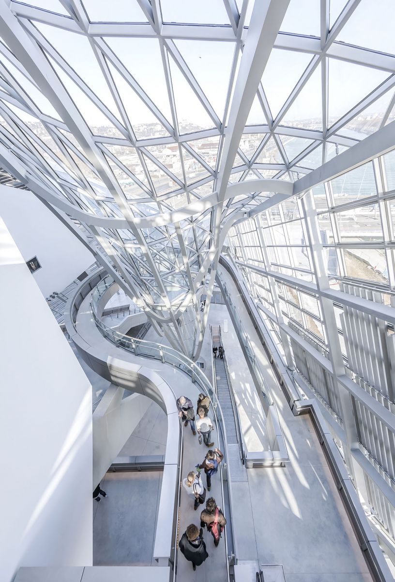 O Museu das Confluências, centro de ciências localizado em Lyon, na França, projetado pelo escritório austríaco Coop Himmelblau, exigiu uma complexa engenharia. A proposta combina em uma mesma edificação dois formatos diametralmente opostos: o de uma nuvem e o de um cristal. A ideia foi estabelecer um contraste entre dois volumes principais, um de característica mais rígida, com formas mais retas, e outro fluido, maleável e orgânico. Para criar este efeito, os arquitetos exploraram a movimentação criadas pelas ondas e inclinações do vidro curvado.