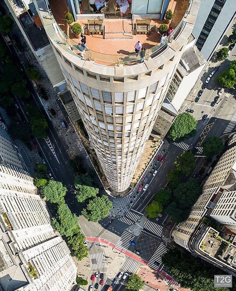 No Terraço Itália, também em São Paulo, a T2G instalou guarda-corpo em temperado laminado curvo 20mm preso por Sistema Spider
