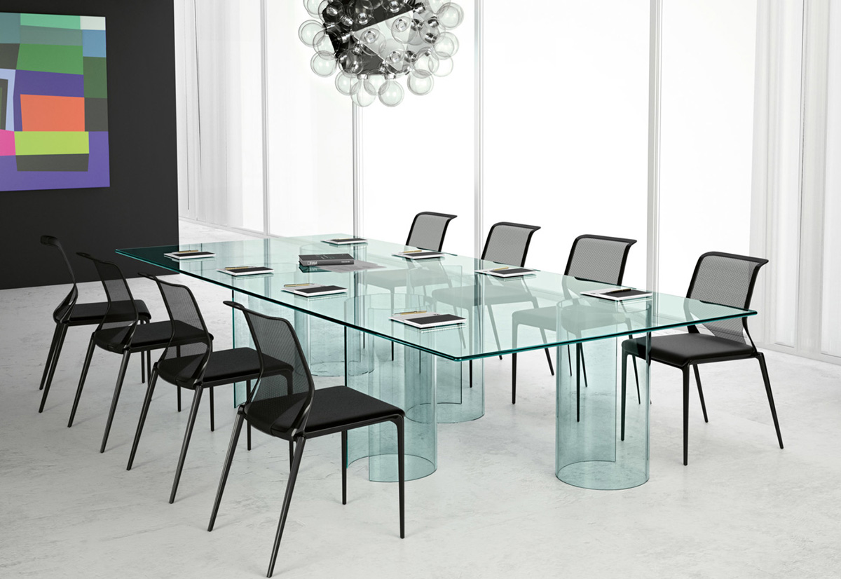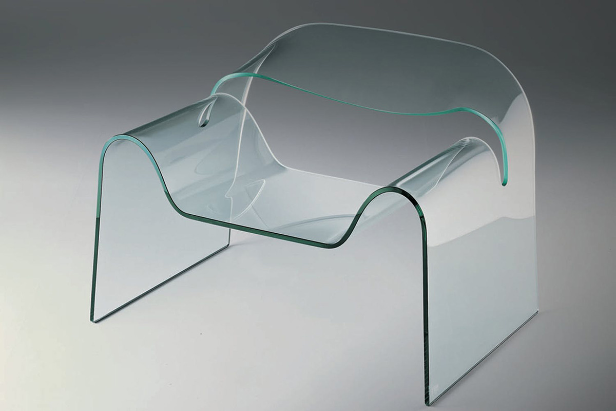 O vidro curvo também é bastante aplicado em peças de arquitetura e decoração. A marca italiana Fiam possui uma série de modelos arrojados e super modernos de móveis com vidro curvo.